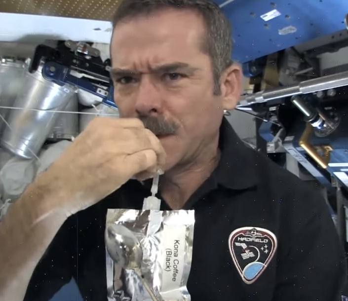 초콜릿 푸딩이랑 커피를 너무 맛있게 드시는 우주인 아조씨(출처: Canadian space Agency)